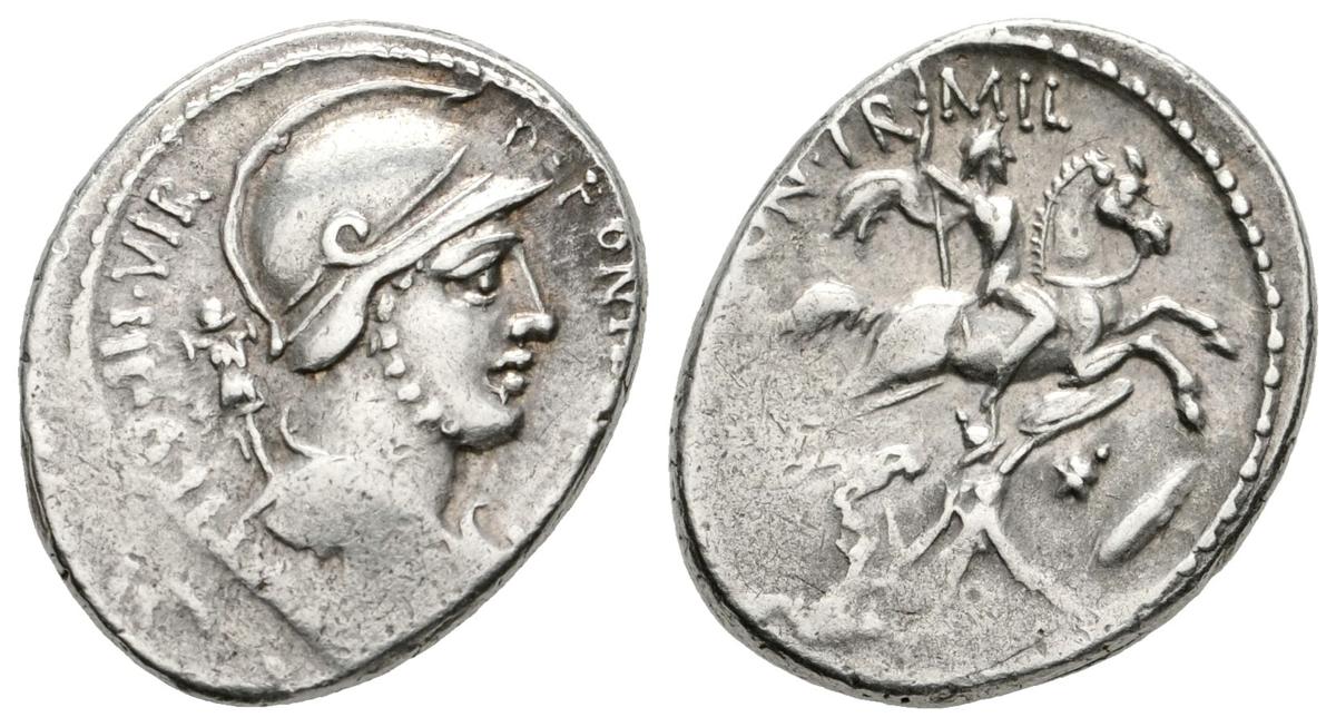 P. FONTEIUS. P.F. CAAPITO. Denario. 55 a.C. Roma. A/ Busto de Marte a derecha, detrás trofeo, P. FONTEIVS P. F. CAPITO III VIR. R/ Jinete con lanza a derecha luchando contra dos enemigos arrodillados, MN. FONT. TR. MIL. Craw 429.1. Ar. 3,90g. EBC-.