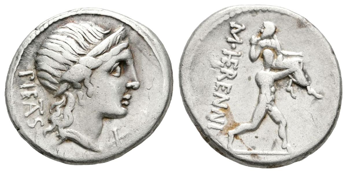M. HERENNIUS. Denario. 101 a.C. Roma. A/ Cabeza de Pietas con Stephane a derecha, detrás PIETAS. R/ Huida de Anfinomo y su padre de las lavas del Etna, delante X y detrás M.HERENNI. Craw 308.1a. Ar. 4,11g. MBC.