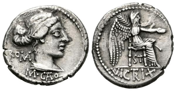 M. PORCIUS CATO. Denario. 80 a.C. Roma. A/ Busto de la libertad a derecha, detrás ROMA debajo M.CATO. R/ Victoria alada sentada a derecha con pátera y palma, bajo la silla ST, en el exergo VICTRIX. Craw 343.1c. Ar. 3,46g. MBC+.