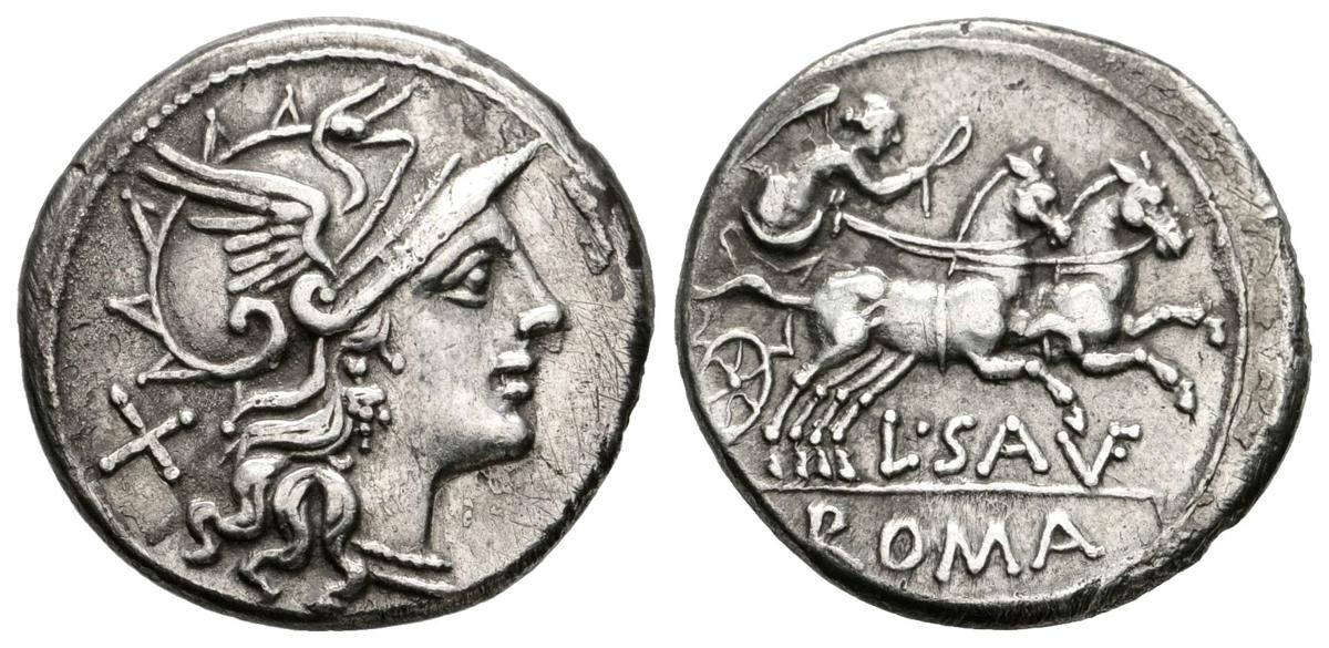 L. SAUFEIUS. Denario. 152 a.C. Roma. A/ Cabeza de Roma a derecha, detrás X. R/ Victoria con látigo en biga a derecha, debajo L SAVF y en exergo ROMA. Craw 204.1. Ar. 3,55g. EBC-.