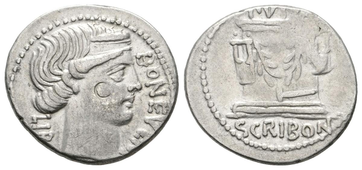 L. SCRIBONIUS. LIBO. Denario. 62 a.C. Roma. A/ Busto diademado de Bonus Eventus a derecha. LIBO BON EVENT. R/ Pozo Scriboniano revestido con guirnaldas y dos liras laterales, debajo martillos. En exergo SCRIBON, encima (PUTEAL). Craw 416.1a. Ar. 3,92g. Contramarca en anverso. MBC.
