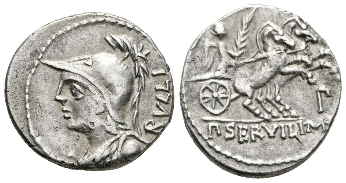 P. SERVILIUS RULLUS. Denario. 100 a.C. Norte de Italia. A/ Busto de Minerva a Izquierda, detrás RULLI. R/ Victoria portando palma en biga a derecha, debajo P. Craw 328.1. Ar. 3,83g. MBC/MBC+.