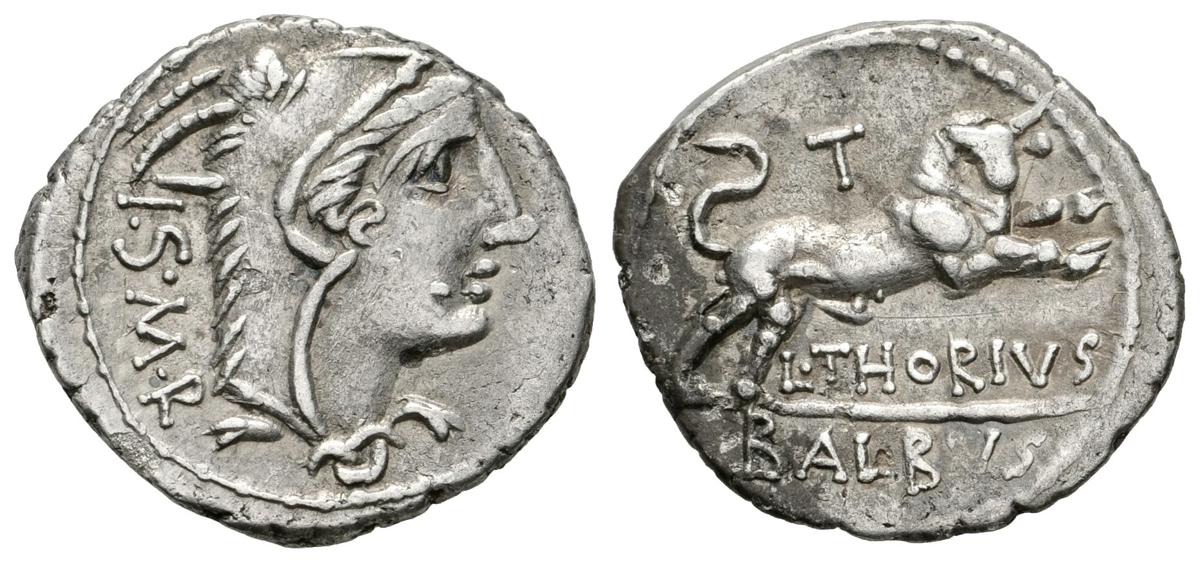 L. THORIUS BALBUS. Denario. 105 a.C. Roma. A/ Busto de Juno Sospita a derecha, cubierta con piel de cabra, detrás I·S·M·R. R/ Toro a derecha con las patas delanteras levantadas, encima T y debajo L.THORIUS, en el exergo BALBUS. Craw 316.1. Ar. 3,60g. MBC+.