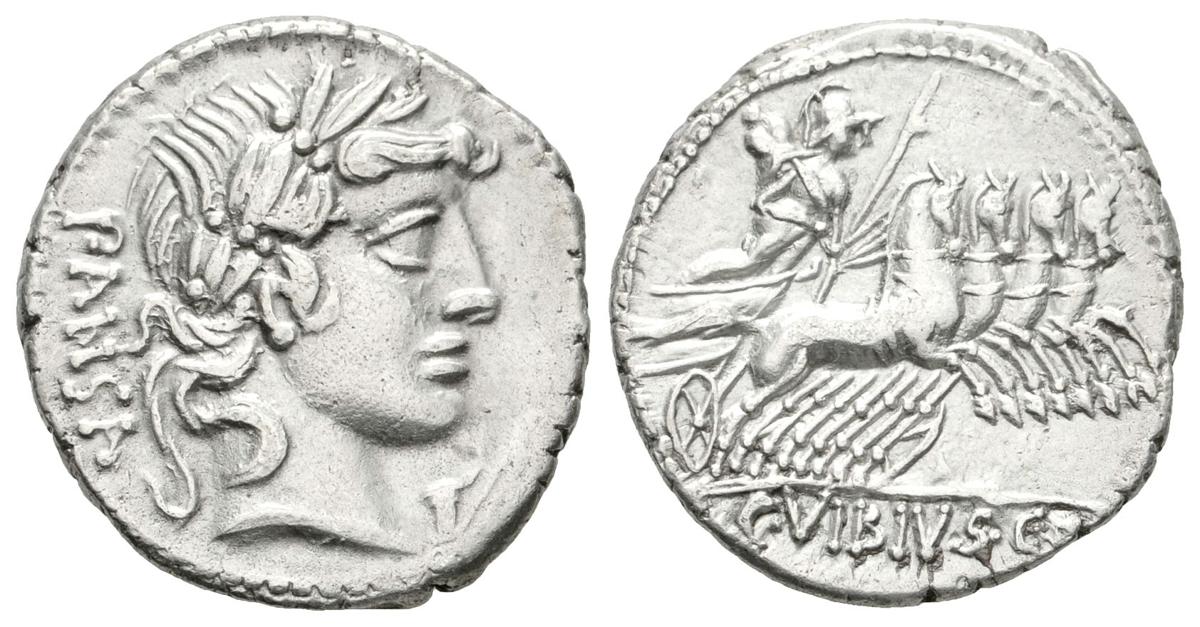 C. VIBIUS. PANSA. Denario. 90 a.C. Roma. A/ Cabeza laureada de Apolo a derecha, bajo la barbilla símbolo, detrás PANSA. R/ Minerva en cuádriga con cetro y trofeo, debajo C VIBIVS CF. Craw 342.5b. Ar. 3,82g. MBC+.