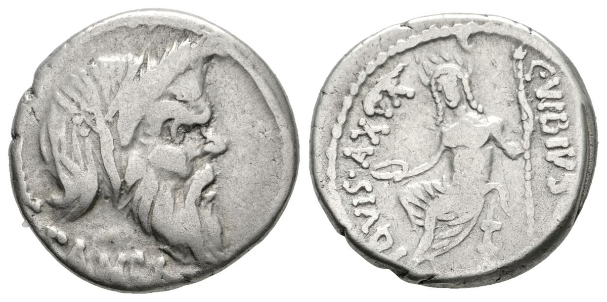 C. VIBIUS. C.F. PANSA. Denario. 48 a.C. Roma. A/ Máscara de Pan a derecha detrás PENDUM y debajo PANSA. R/ Júpiter Axur sentado a izquierda con pátera y cetro. IOVI AXUR C VIBIVS C F C N. Craw 449.1b. Ar. 3,73g. MBC.