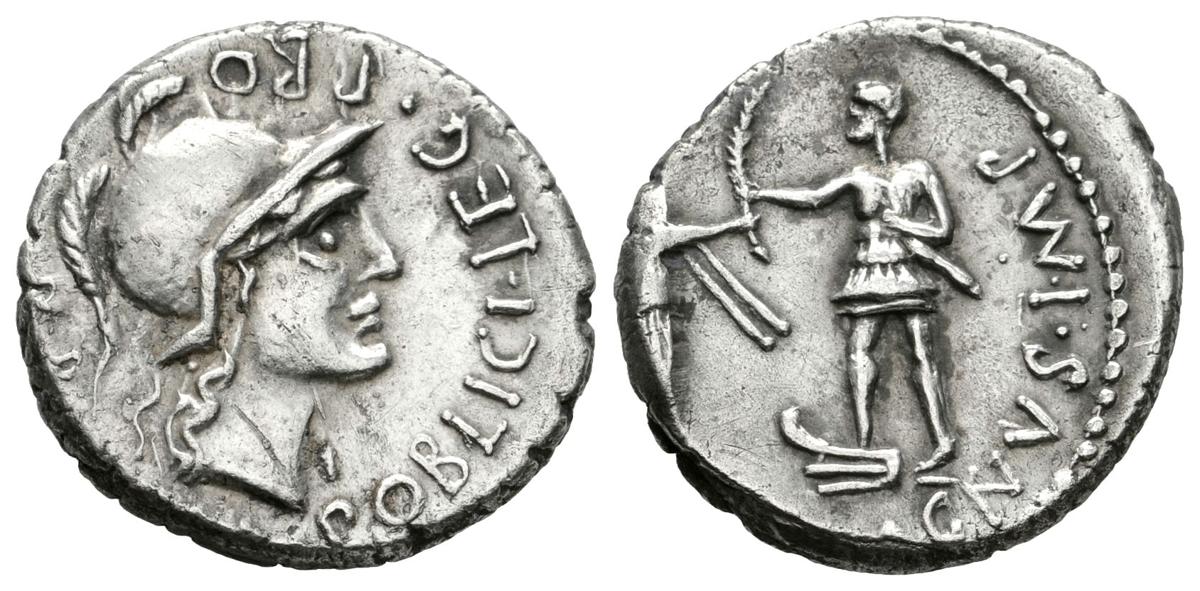 CNAEO POMPEYO MAGNO. Denario. 46-45 a.C. Hispania. A/ Cabeza de Roma a derecha. (M)·POBLICI·LEG·PRO·PR. R/ Figura femenina en pie a derecha con escudo colgado a la espalda y sosteniendo dos lanzas, esta entrega palma a soldado en pie a izquierda sobre proa. Craw 469.1a; Sy 1035; Sear Imperators 48a. Ar. 4,06g. Acuñación del reverso desplazada. EBC-.
