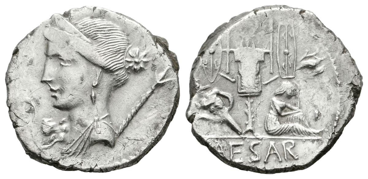 JULIO CESAR. Denario. 46-45 a.C. Ceca militar móvil (Hispania). A/ Busto drapeado de Venus a izquierda, delante lituus y busto de cupido, detrás cetro. R/ Trofeo de armas galas entre dos cautivos sentados, en exergo CAESAR. Craw 468.2; CRI 59; Sy 1015; BMCRR Spain 86-8; RSC 14. Ar. 3,83g. MBC.
