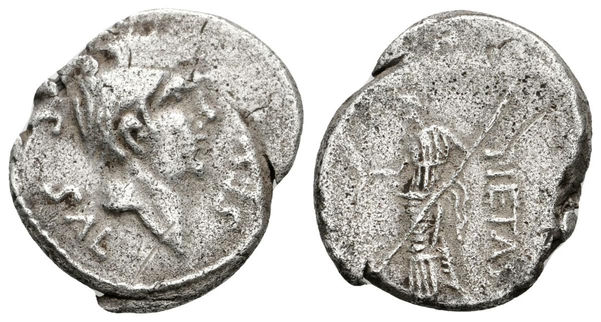 SEXTO POMPEYO MAGNO. Denario. 44-45 a.C. Sur de España. A/ Cabeza de Cnaeus Pompeius a derecha (SEX) MAGN–(IM)P SAL. R/ Pietas en pié sosteniendo palma y cetro transversal. PIETAS. RBW 1670; Craw 477/1b. Ar. 3,38g. MBC. Muy rara.