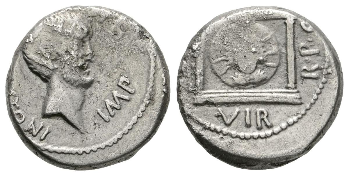 MARCO ANTONIO. Denario. 42 a.C. Ceca volante. A/ Cabeza descubierta y barbada de Marco Antonio a derecha, delante IMP, detrás M. ANTONI. R/ Cabeza radiada del Sol en el interior de templo dístilo. A la izquierda III, debajo VIR, a derecha R.P.C. Craw 496.1. Ar. 3,85g. MBC-. Rara.