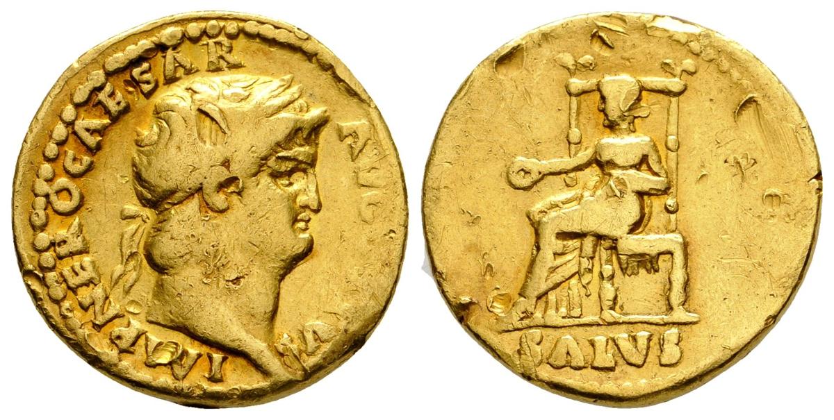 NERON. Aureo. 65-66 d.C. Roma. A/ Busto laureado a derecha. IMP NERO CAESAR AVGVSTVS. R/ Salus sentada a izquierda en trono ornamentado y sosteniendo pátera, en exergo SALVS. RIC 66; BMC 94; Calicó 445; Cohen 317. Au. 7,60g. Golpes en ambas caras. MBC-.