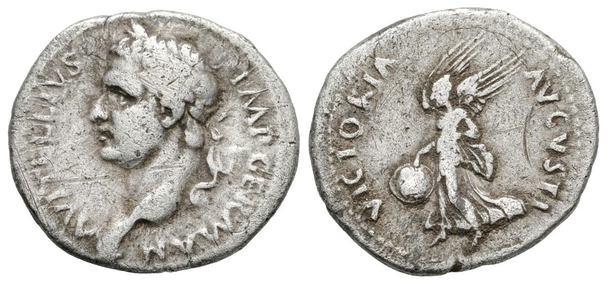 VITELIO. Denario. 69 d.C. Tarraco. A/ Cabeza laureada a izquierda, debajo globo. A VITELLIVS IMP GERMAN. R/ Victoria en marcha a izquierda con escudo con S.P.Q.R. alrededor VICTORIA AVGVSTI. RIC 36. Ar. 3,39g. MBC-.