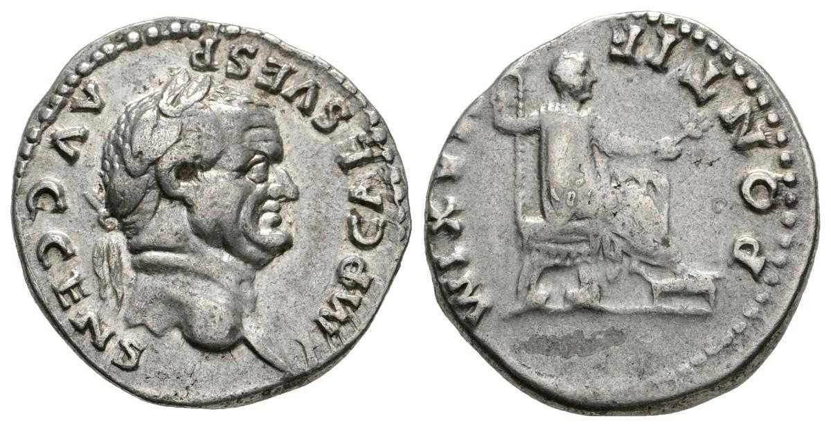 VESPASIANO. Denario. 73 d.C. Roma. A/ Busto laureado a derecha. IMP CAES VESP AVG CENS. R/ Emperador sentado en silla curul con los pies descansado sobre un taburete, este sostiene cetro y rama de olivo. PONTIF MAXIM. RIC 545. Ar. 3,64g. MBC+/MBC-.