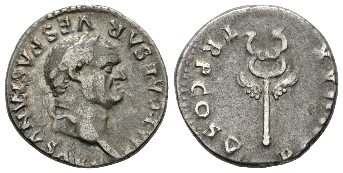VESPASIANO. Denario. 69-79 d.C. Roma. A/ Busto laureado a derecha. IMP CAESAR VESPASIANVS AVG. R/ Caduceo alado. PON MAX TR P COS V. RIC 703. Ar. 3,38g. MBC-.