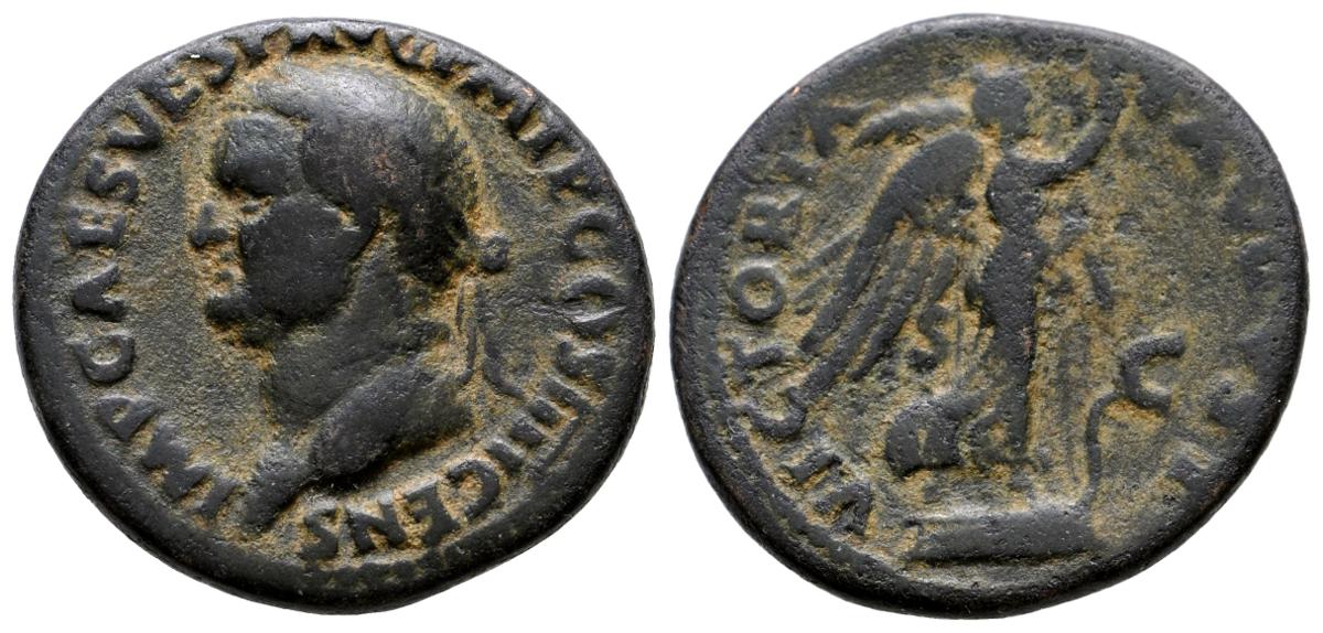 VESPASIANO. As. 74 d.C. Roma. A/ Busto laureado a izquierda. IMP CAESAR VESP AVG COS IIII CENS. R/ Victoria en marcha a derecha sobre proa portando corona y palma. VICTORIA AVGVST a ambos lados S-C. RIC 561. Ae. 8,65g. MBC. Escasa.