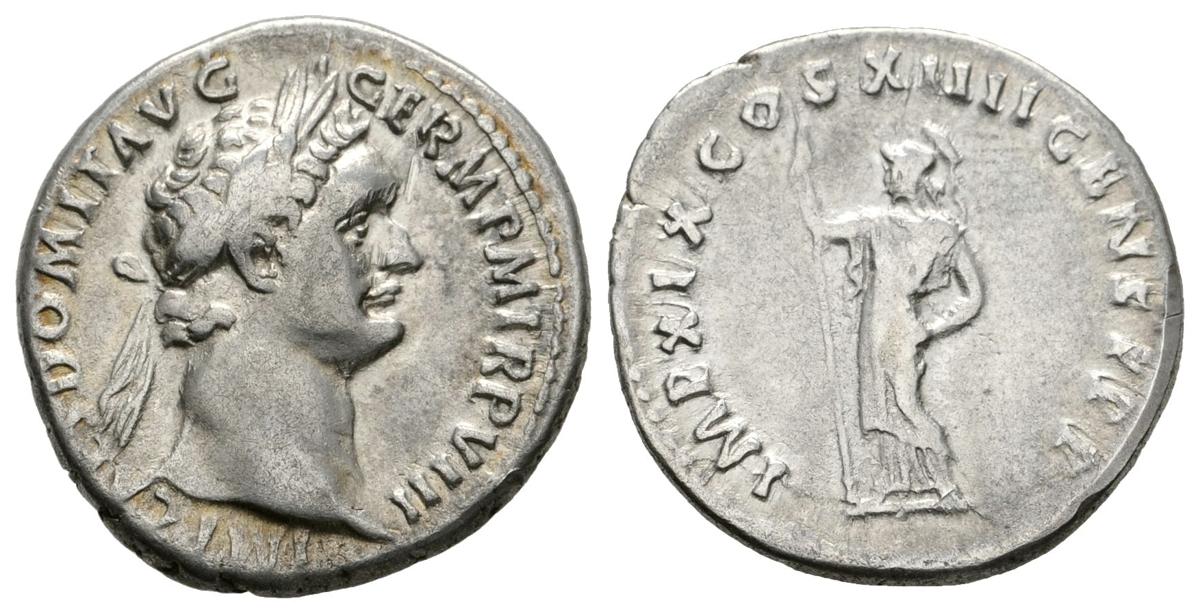 DOMICIANO. Denario. 81-96 d.C. Roma. A/ Busto laureado a derecha. IMP CAES DOMIT AVG GERM P M TR P VIII. R/ Minerva pie a izquierda portando lanza. IMP XIX COS XIIII CENS P P P. RIC 670. Ar. 3,54g. MBC/MBC-.