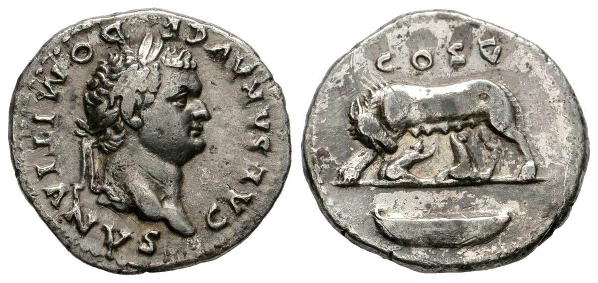 DOMICIANO. Denario. 77-78 d.C. Roma. A/ Busto laureado a derecha. CAESAR AVG F DOMITIANVS. R/ Loba en pie a izquierda amamantando a los gemelos Rómulo y Remo, bajo esta una barca. COS V. RIC 961. Ar. 3,53g. MBC.