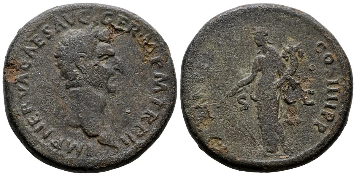 NERVA. Sestercio. 96-98 d.C. Roma. A/ Busto laureado a derecha. IMP NERVA CAES AVG GERM P M TR P II. R/ Fortuna estante a izquierda portando timón y cornucopia. IMP II-COS IIII P P. RIC 105 var. Ae. 23,44g. BC+. Escasa.