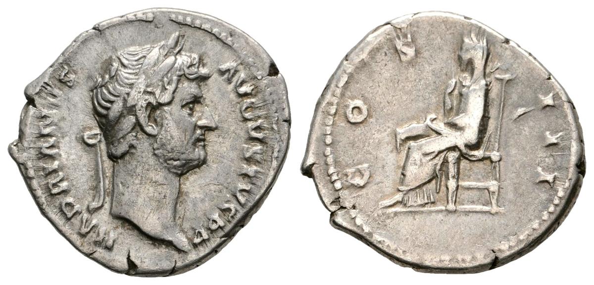 ADRIANO. Denario. 125-128 d.C. Roma. A/ Busto laureado a derecha. HADRIANVS AVGVSTVS P P. R/ Pudicitia sedente a izquierda sujetando su velo. COS III. RIC 343. Ar. 3,55g. MBC-.