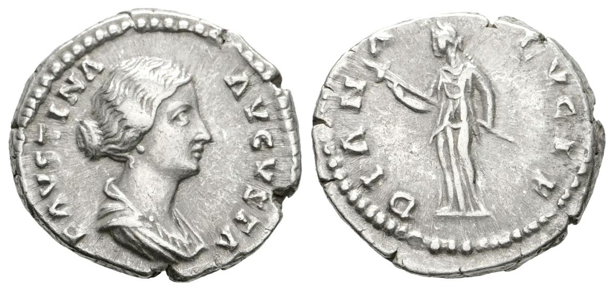 FAUSTINA HIJA. Denario. 175-176 d.C. Roma. A/ Busto drapeado a derecha FAVSTINA AVGVSTA. R/ Diana en pié a izquierda sosteniendo antorcha de forma transversal y sujetada con ambas manos. DIANA LUCIF. RIC III 674. Ar. 3,30g. MBC+.