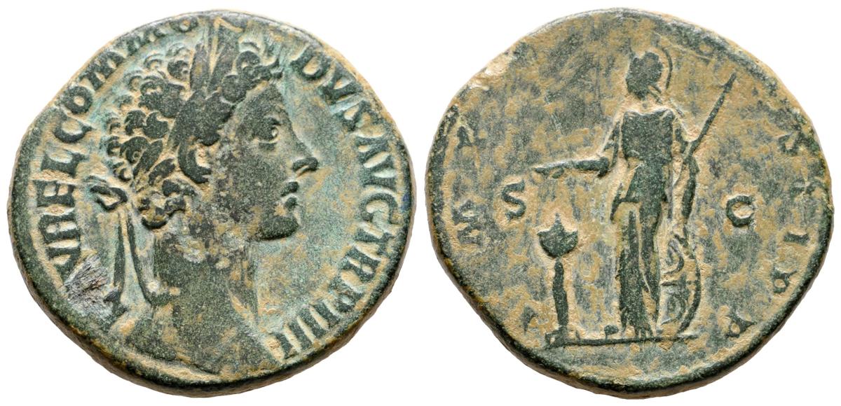 COMODO. Sestercio. 177-192 d.C. Roma. A/ Busto laureado a derecha. L AVREL COMMODVS AVG TR P IIII. R/ Minerva estante a izquierda con mano derecha extendida sobre candelabro y mano izquierda sobre escudo y lanza. IMP III COS II P P / S-C. RIC 1607. Ae. 21,58g. MBC/MBC-.