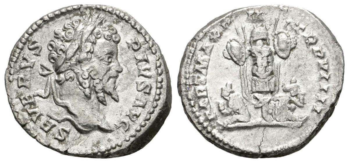 SEPTIMIO SEVERO. Denario. 193-211 d.C. Roma. A/ Busto laureado a derecha. SEVERVS PIVS AVG. R/ Trofeo con dos cautivos sentados a ambos lados en su base. PART MAX P M TR P VIIII. RIC 176. Ar. 3,49g. Marquita en anverso. MBC.