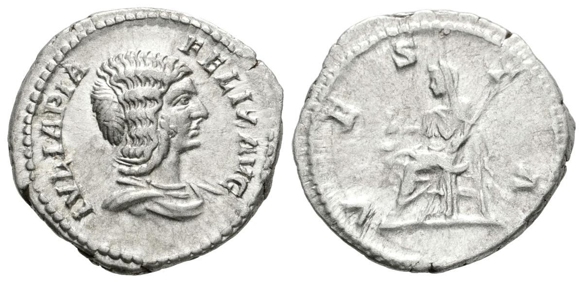 JULIA DOMNA. Denario. 193-217 d.C. Roma. A/ Busto drapeado a derecha. IVLIA PIA FELIX AVG. R/ Vesta sedente a izquierda portando símpulo y cetro. VESTA. RIC 391. Ar. 2,74g. MBC+/MBC.