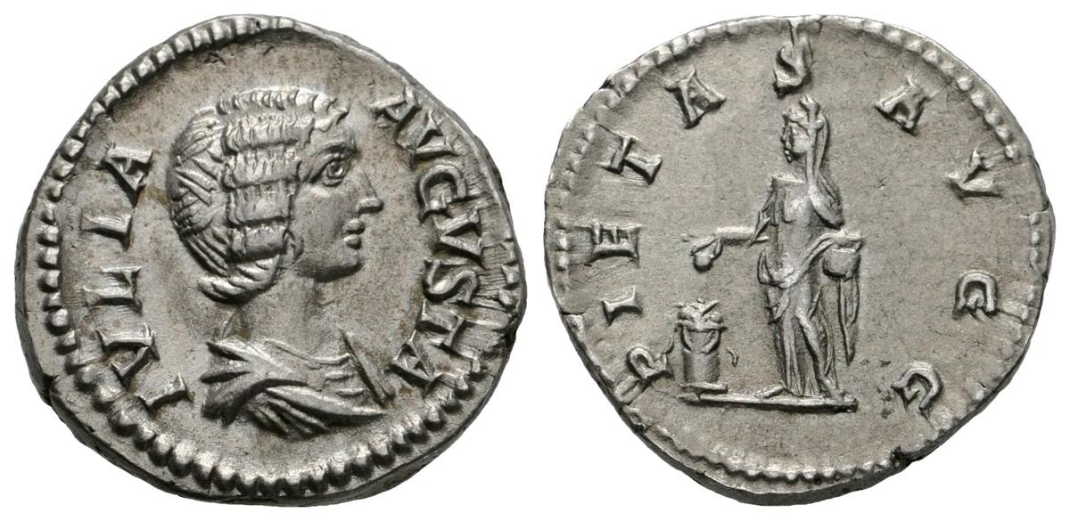 JULIA DOMNA. Denario. 193-217 d.C. Roma. A/ Busto drapeado a derecha. IVLIA AVGVSTA. R/ Pietas estante a izquierda sosteniendo acerrum y dejando caer incienso sobre altar en llamas. PIETAS AVGG. RIC 572 (Septimius). Ar. 3,84g. EBC.