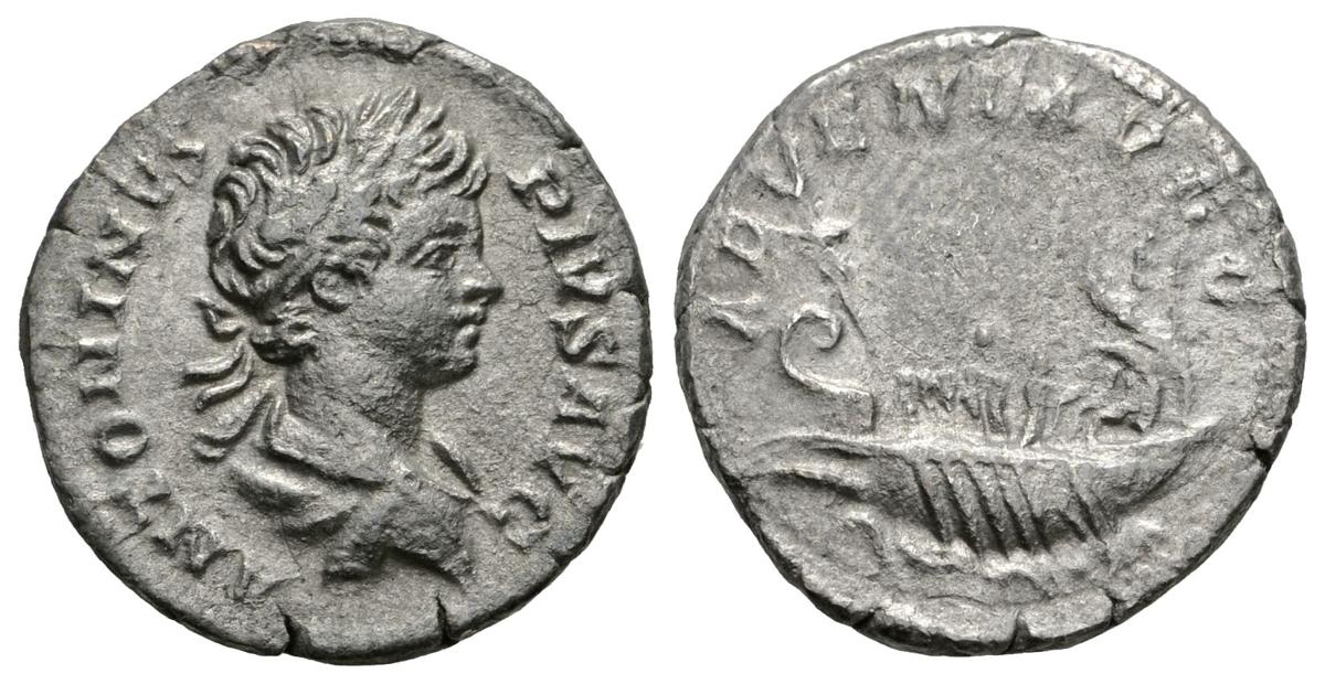 CARACALLA. Denario. 201-206 d.C. Roma. A/ Busto laureado y drapeado a derecha. ANTONINVS PIVS AVG. R/ Galera en marcha a derecha con remeros y pasajeros. ADVENT AVGG. RIC 120. Ar. 2,00g. MBC+. Escasa.