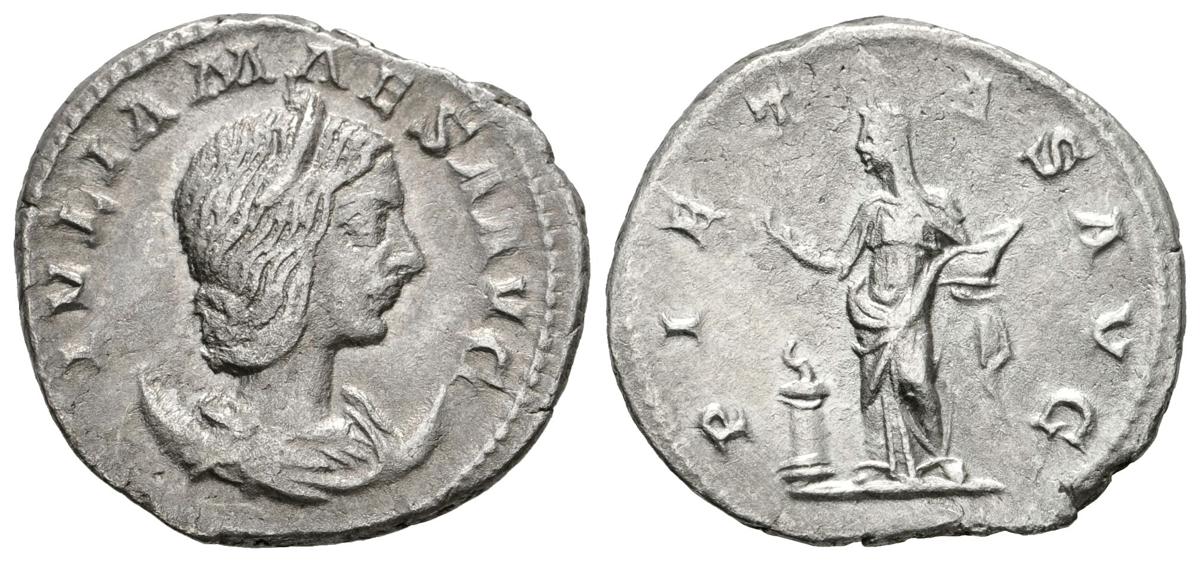 JULIA MAESA. Antoniniano. 218-220 d.C. Roma. A/ Busto con diadema y drapeado a derecha sobre creciente. IVLIA MAESA AVG. R/ Pietas en pie a izquierda sosteniéndo acerrum y extendiendo la mano sobre altar en llamas. PIETAS AVG. RIC 264 (Elagabalus). Ar. 4,81g. MBC/MBC+.