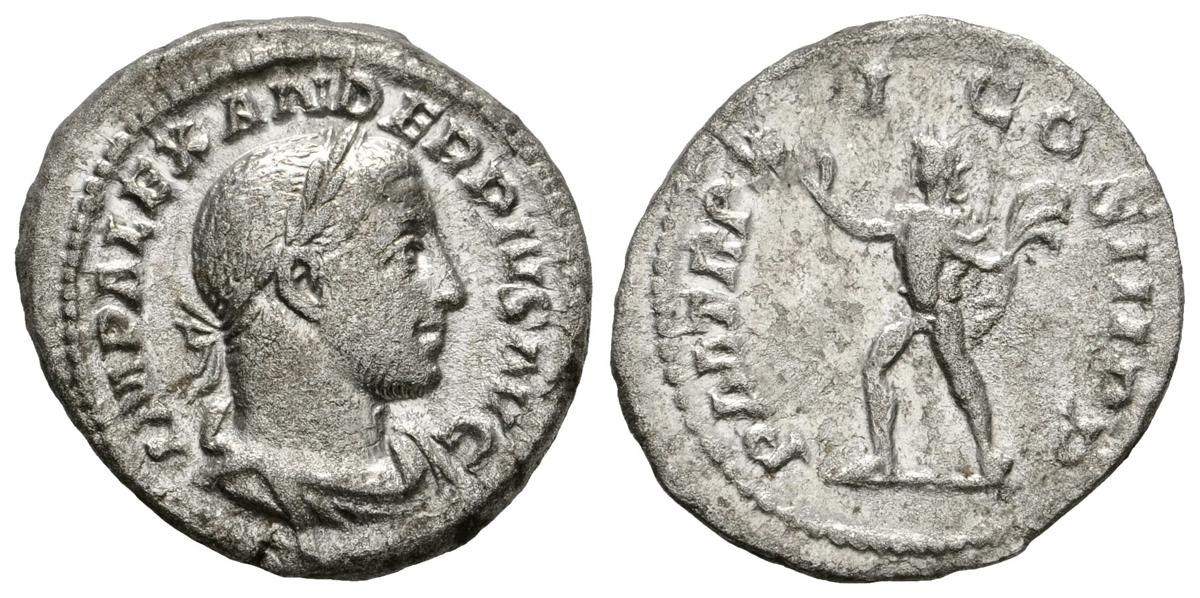 ALEJANDRO SEVERO. Denario. 232 d.C. Roma. A/ Busto laureado y drapeado con coraza a derecha. IMP ALEXANDER PIVS AVG. R/ Sol avanzando a izquierda con mano alzada y portando látigo. RIC 114. Ar. 3,29g. Algo poroso. MBC.