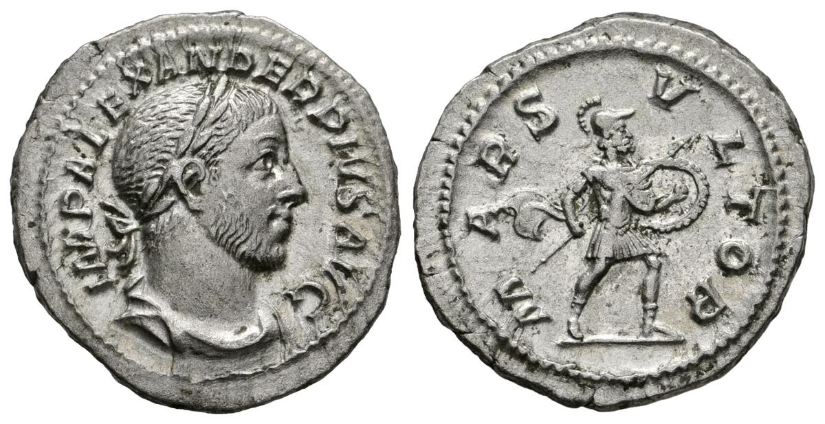 ALEJANDRO SEVERO. Denario. 231-235 d.C. Roma. A/ Busto laureado y drapeado con coraza a derecha. IMP ALEXANDER PIVS AVG. R/ Marte en marcha a izquierda portando lanza y escudo. MARS VLTOR. RIC 246. Ar. 3,62g. EBC-/MBC+.