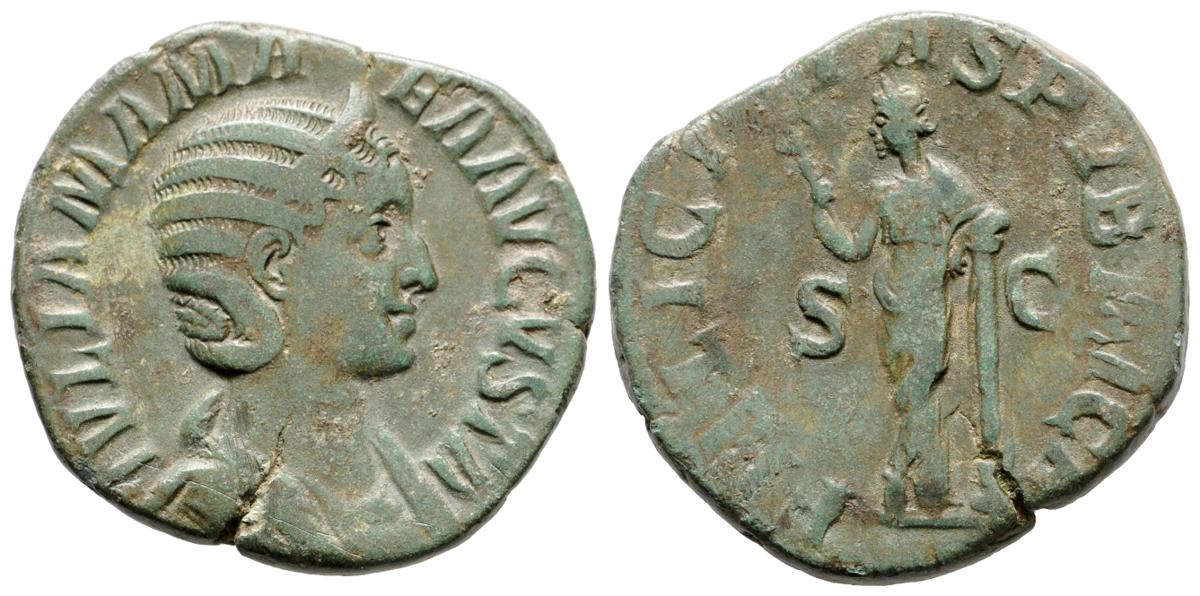 JULIA MAMAEA. Sestercio. 222-235 d.C. Roma. A/ Busto drapeado a derecha IVLIA MAMAEA AVGVSTA. R/ Felicitas en pié a izquierda sosteniendo caduceo y apoyandose en columna. FELICITAS PVBLICA / S-C. RIC 676. Ae. 14,04g. MBC.