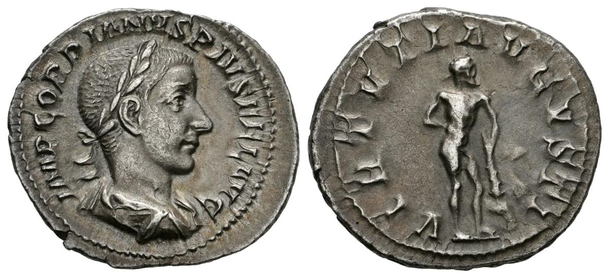 GORDIANO III. Denario. 238-244 d.C. Roma. A/ Busto laureado y drapeado con coraza a derecha. IMP GORDIANVS PIVS FEL AVG. R/ Hércules a derecha con piel de león y sobre clava. VIRTVTI AVGVSTI. RIC 116. Ar. 2,88g. Bonito tono. EBC.