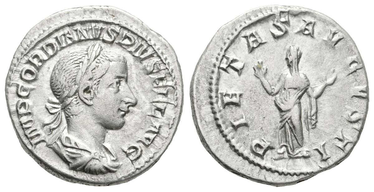 GORDIANO III. Denario. 238-244 d.C. Roma. A/ Busto laureado y drapeado con coraza a derecha. IMP GORDIANVS PIVS FEL AVG. R/ Piedad en pie a izquierda alzando ambas manos. PIETAS AVGVSTI. RIC 129. Ar. 3,25g. MBC+.