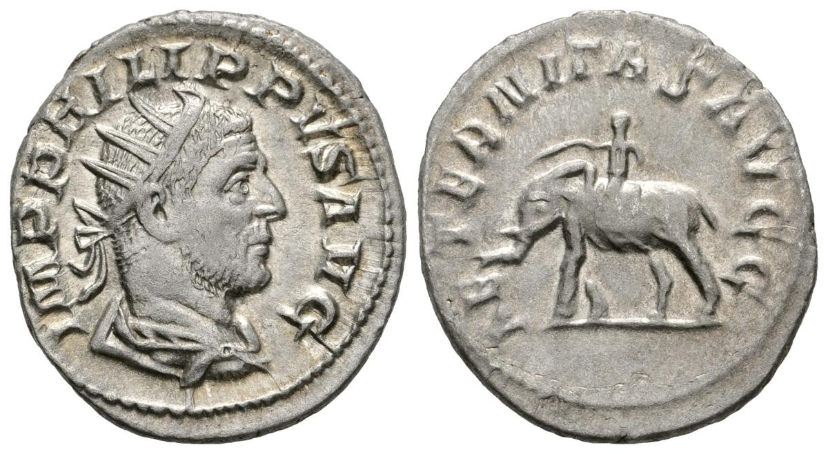 FILIPO I. Antoniniano. 244-249 d.C. Roma. A/ Busto radiado y drapeado con coraza a derecha. IMP PHILIPPVS AVG. R/ Elefante marchando a izquierda guiado por mahout. AETERNITAS AVGG. RIC 58. Ar. 3,58g. MBC+.