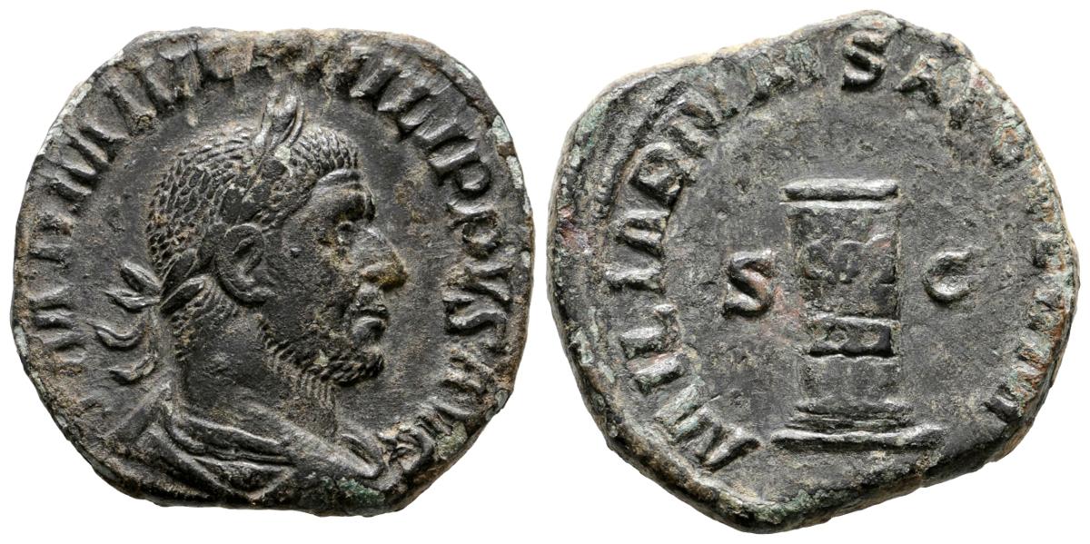 FILIPO I. Sestercio. 244-249 d.C. Roma. A/ Busto laureado y drapeado con coraza a derecha. IMP M IVL PHILIPPVS AVG. R/ Columna con inscripción COS III, alrededor MILIARIVM SAECVLVM-S C. RIC 157a. Ae. 13,60g. MBC+/MBC.