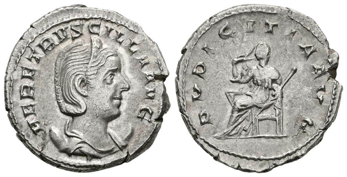 HERENNIA ETRUSCILLA. Antoniniano. 250 d.C. Roma. A/ Busto diademado y drapeado a derecha. HER ETRVSCILLA AVG. R/ Pudicitia sedente a izquierda portando cetro y retirando el velo de su cara. PVDICITIA AVG. RIC 59b. Ar. 4,94g. MBC+.