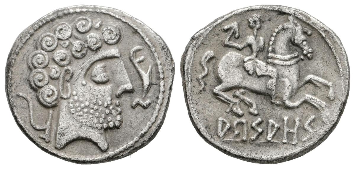 ARSAOS. Denario. 120-80 a.C. Zona de Navarra. A/ Cabeza masculina barbada a derecha con doce rizos, delante delfín y detrás arado. R/ Jinete con dardo a derecha, debajo ARSAOS. FAB-139. Ar. 3,81g. MBC+. Escasa.