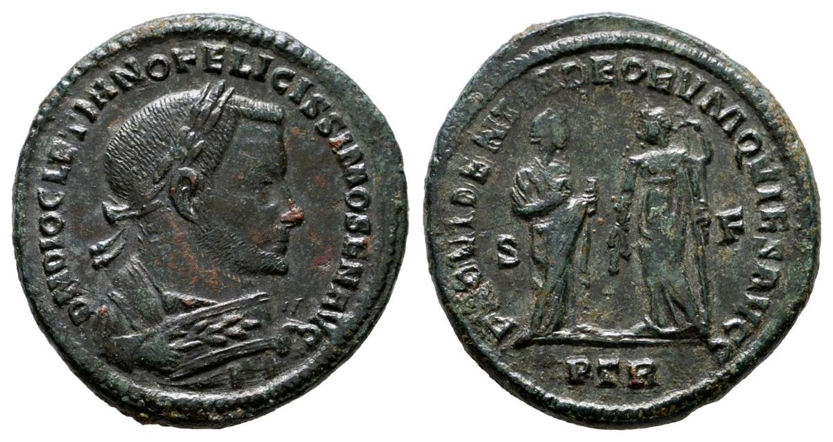 DIOCLECIANO. Follis. 305-307 d.C. Treveri. A/ Busto laureado a derecha vestido con manto imperial portando rama de olivo y mapa. D N DIOCLETIANO FELICISSIMO SEN AVG. R/ Providentia a derecha, extendiendo la mano a Quies a izquierda, sosteniendo rama y apoyándose en el cetro, S-F en el campo y en exergo PTR. PROVIDENTIA DEORVM QVIES AVGG. RIC 677a. Ae. 9,18g. MBC+. Escasa.