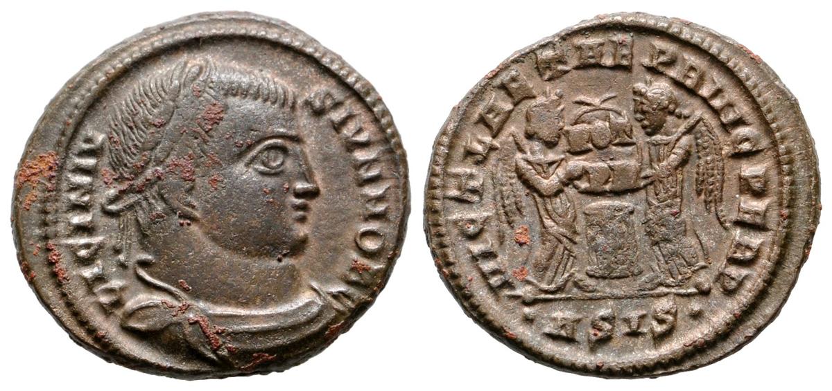 LICINIO II. Follis. 319-320 d.C. Siscia. A/ Busto laureado con coraza a derecha. LICINIVS IVN NOB C. R/ Dos victorias sujetando escudo con inscripción VOT-TR debajo altar, en exergo ASIS. VICTORIAE LAETAE PRINC PERP. RIC VII 98. Ae. 4,00g. EBC-. Escasa.