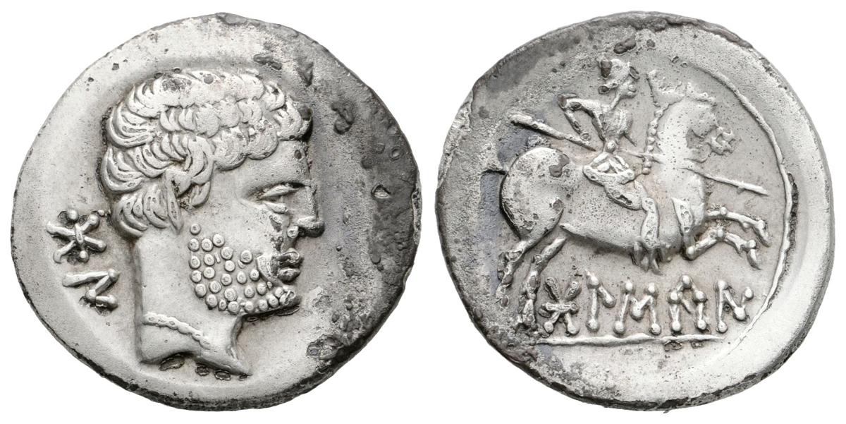 BOLSCAN. Denario. 180-20 a.C. Huesca. Tipo palenzuela. A/ Cabeza barbada a derecha, detrás BoN. R/ Jinete con lanza a derecha, debajo BoLSCaN. FAB-1911. Ar. 4,98g. MBC.