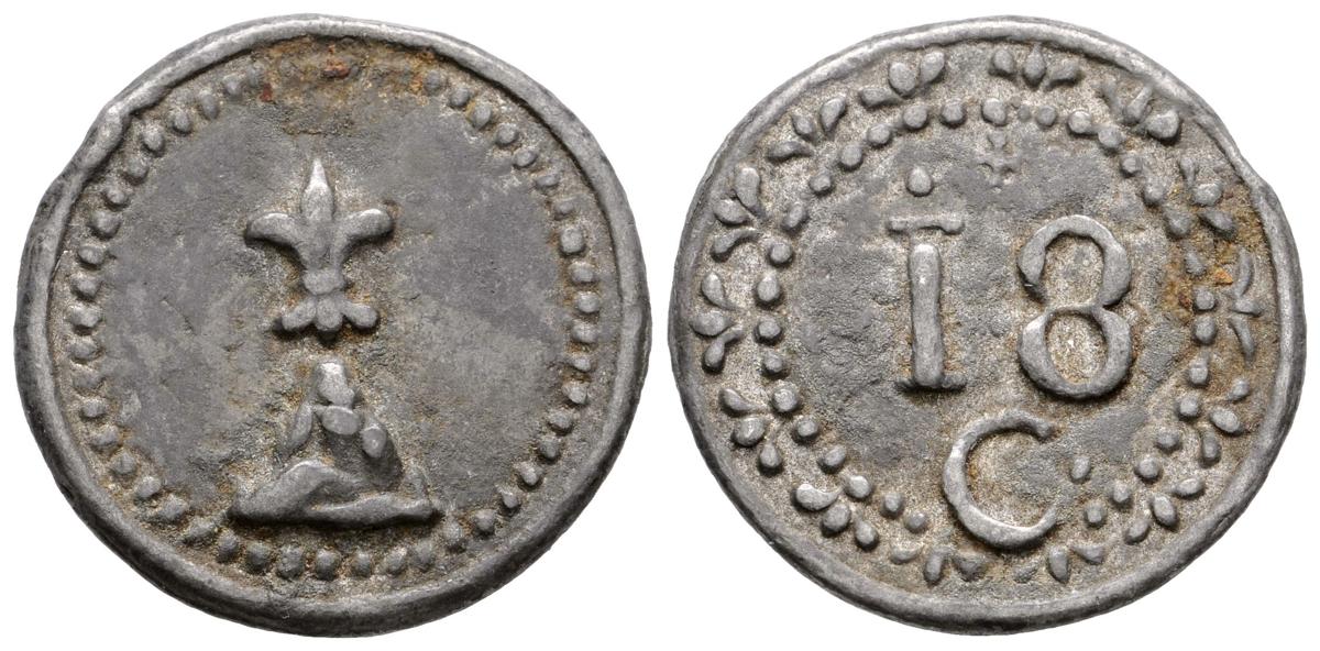 MONTUIRI. Plomo. Mallorca. A/ Colina, encima lirio. R/ 18 sobre C, encima cruz. Cru.VS 2413. Pb. 4,90g. MBC+.