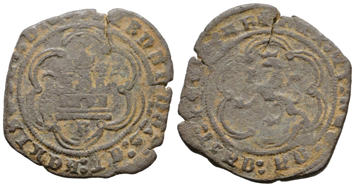 REYES CATOLICOS. 4 Maravedís. Burgos, castillo entre menguantes en lóbulos superiores y B debajo. Cal-518. Ae. 6,61g. MBC-.