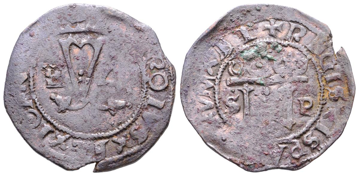 JUANA Y CARLOS. 4 Maravedís. (1504-1555). Santo Domingo. A/ F-4. R/ S-P. Cal-211. Ae. 3,82g. MBC-.
