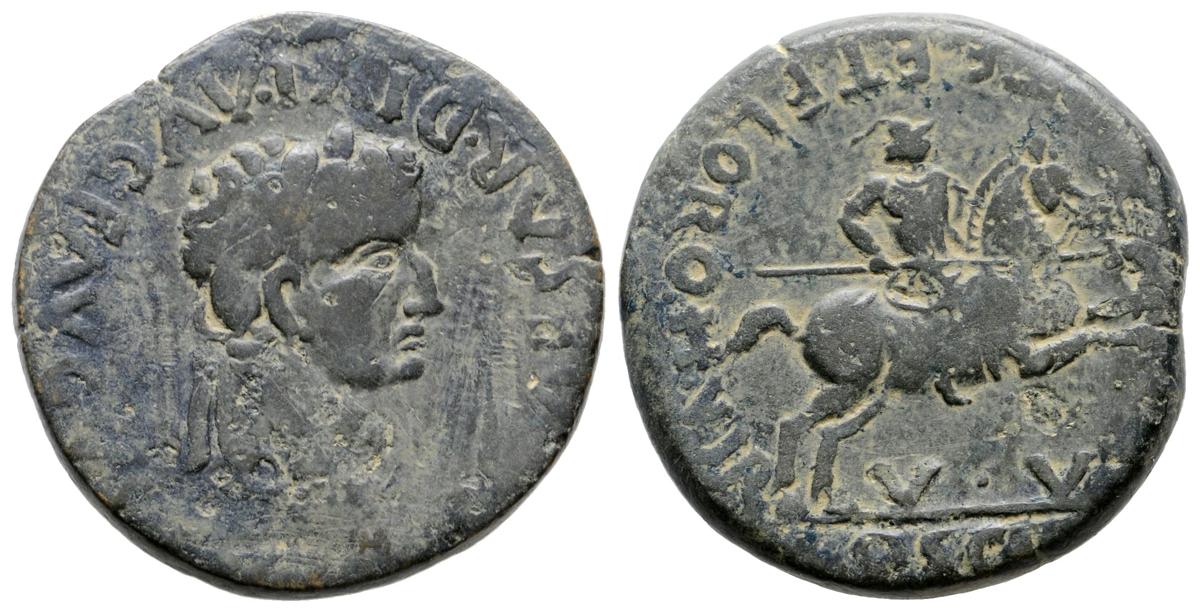 OSCA. As. Epoca de Tiberio. 14-36 a.C. Huesca. A/ Cabeza con láurea de Tiberio a derecha, alrededor TI. CAESAR. DIVI. AVGV. F. AVGVSTVS. R/ Jinete con lanza a izquierda, debajo V. V. OSCA y alrededor HOSPITE. ET. FLORO. II. VIR. FAB-1934. Ae. 12,89g. MBC-.