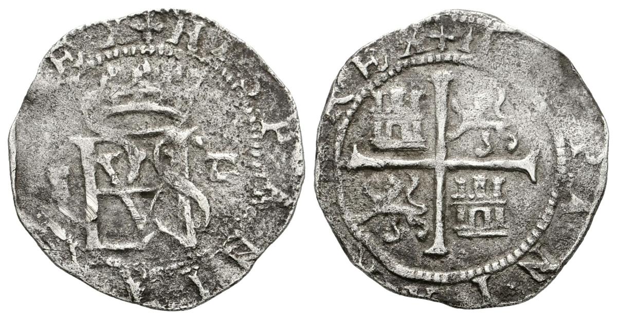 FELIPE II. 1/2 Real. S/D. Sevilla D cuadrada. Leyenda HISPANIARVM REX en ambas caras. Cal-737 var. Ar. 1,55g. MBC-. Rara.