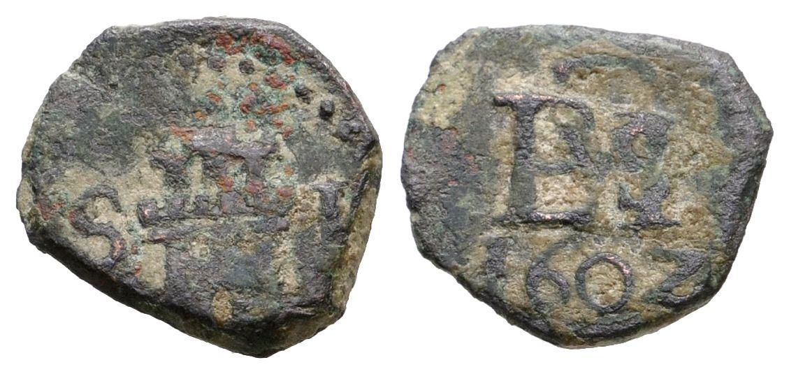 FELIPE III. 1 Maravedí. 1602. Sevilla S. Cal-No catalogada; J.S. D-286. Ae. 0,69g. Muy pocos ejemplares conocidos. MBC-. Muy rara.