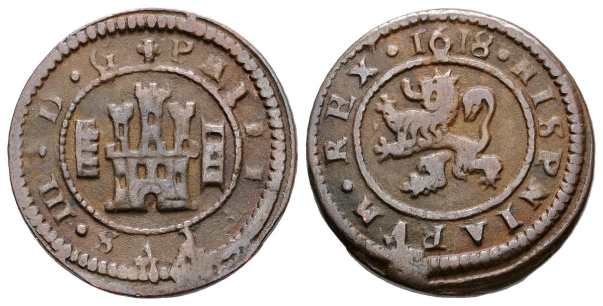 FELIPE III. 2 Maravedís. 1618. Segovia, acueducto de 4 arcos. Error en la leyenda: HISPNIARVM en lugar de HISPANIARVM. J.S. D-254. Ae. 3,21g. MBC-. Rara.