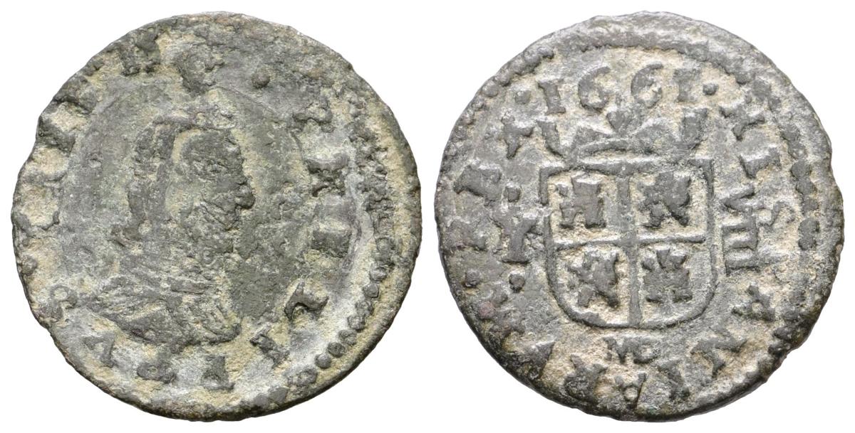 FELIPE IV. 8 Maravedís. 1661. Madrid Y. Cuño rectificado Y sobre A. J.S. M-297. Ae. 1,88g. BC/MBC-. Escasa.