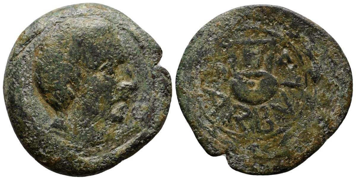 CARBULA. As. 50 a.C. Almodóvar del río (Córdoba). A/ Cabeza masculina a derecha, delante creciente. R/ Dentro de láurea y gráfila líneas, lira, CARBVLA. FAB-439. Ae. 16,70g. MBC-. Rara.